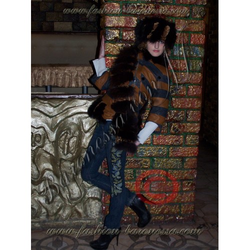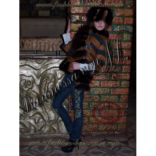 Из пластин песца и рыжей кожи также выполнен воротник куртки, который можно моделировать как отложной, как стойку (благодаря декоративной пуговице на правом плече), а также как отложной борт "косухи", фиксируемый по желанию выше или ниже благодаря декоративным пуговицам на левой грудине и центральной "перевязи".