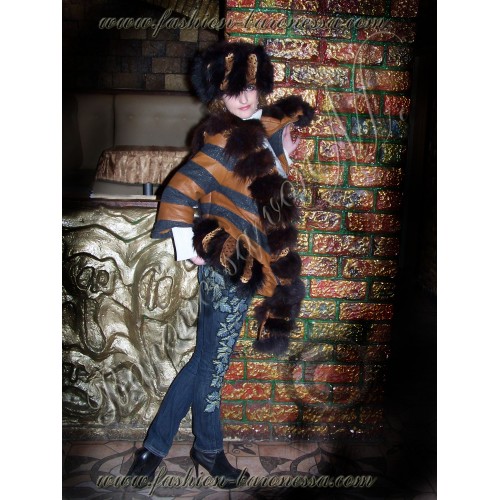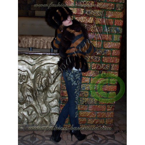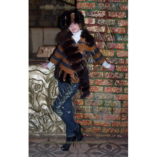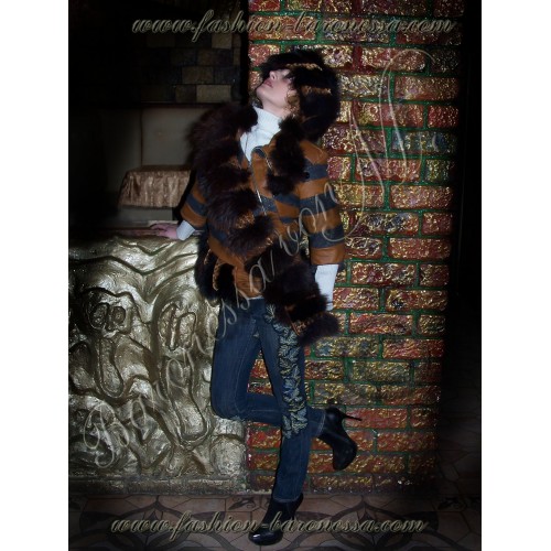 Дизайнерская асимметричная куртка "Patrontash-tiger" с рукавами три четверти. Длина до линии бедер. Центральная "перевязь" по диагонали переда, образуемая пластинами песца и бархата на подстежке, расшитого бисером, красиво драпирует металлическую застежку-"молнию" от правого плеча до низа левой боковину куртки, формируя оригинальную "косуху". При этом внизу "перевязи" сформирован потайной карман с клапаном на кнопке, выполненный из рыжей кожи.