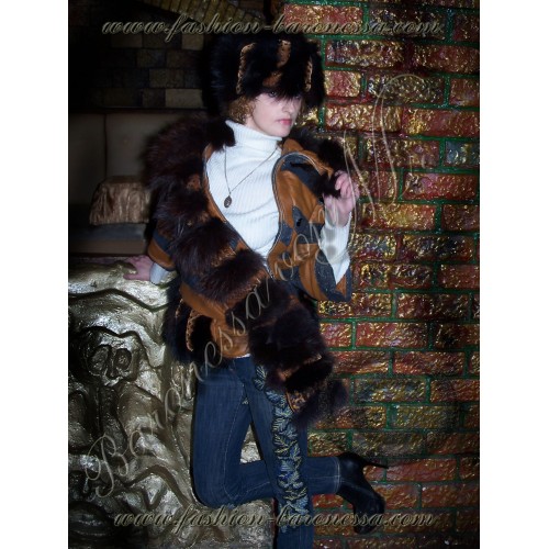 Материалы: рыжая искусственная кожа, темно-синий джинс 75%-ный с золотистым напылением, обработанный влагоотталкивающей пропиткой, мех песца черный с тонированием "темный бордо", рыжий бархат.
